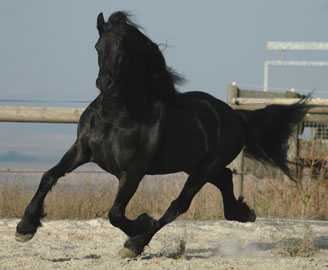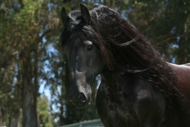 Bolero is an eight year old beautiful Friesian Stallion. He is currently in training with Sabine Schut-Kerry in Somis, California. He has competed at first level, scoring in the 70's. His abilities include Piaffe in Hand, bowing under saddle, and he has started flying lead changes. He has three beautiful gaits. Bolero is a very sweet and honest horse, and she is ideally suited for an inexperienced rider because she is very calm on trails. |